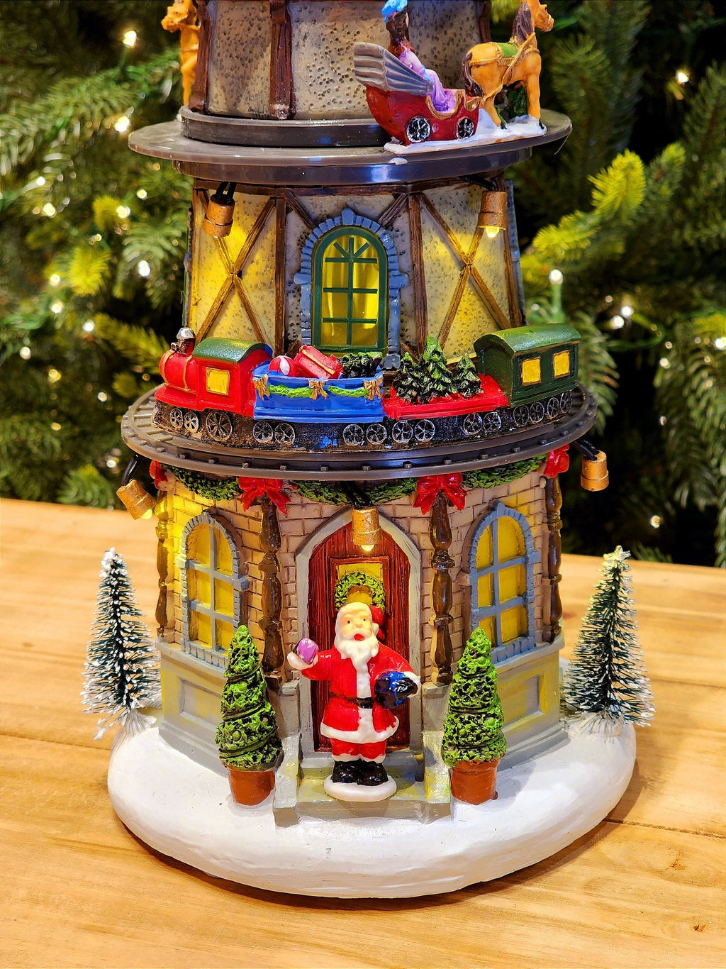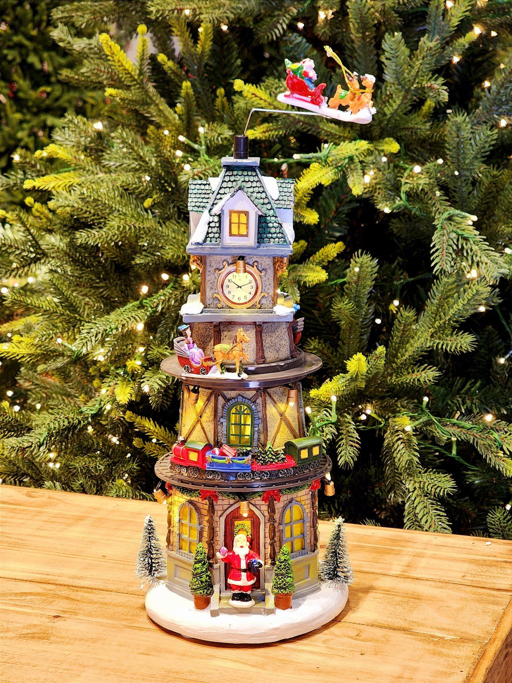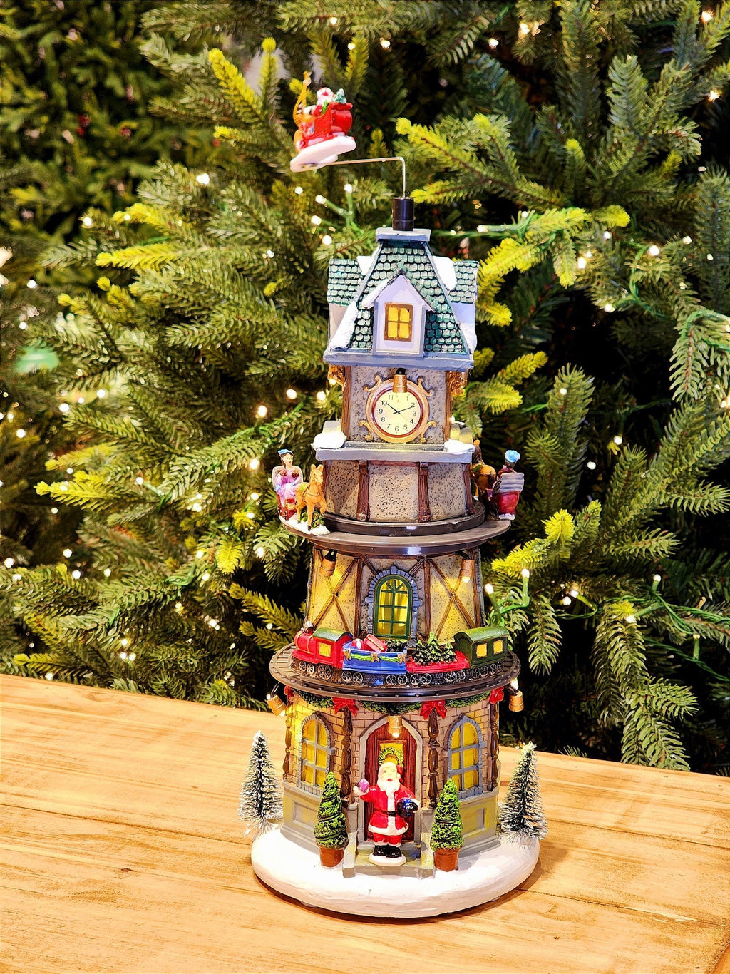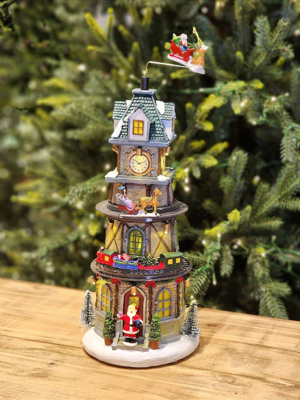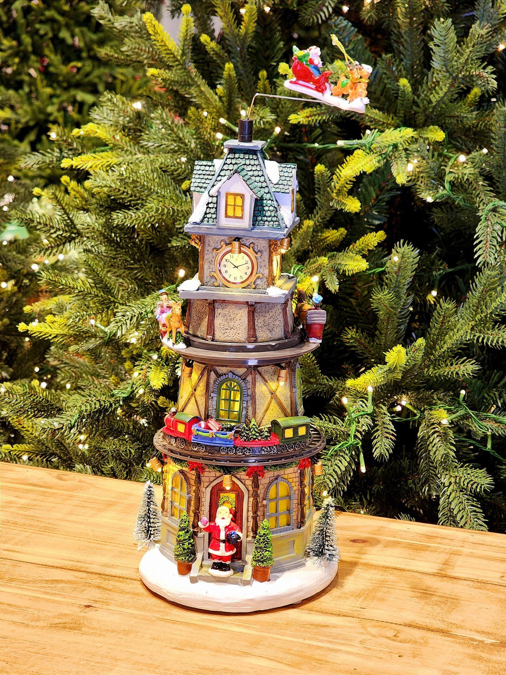 Cenário natalino torre com relógio  decorativo, a peça possui movimento do trenzinho em volta da torre e movimento do treno no topo a peça possui luz e som.